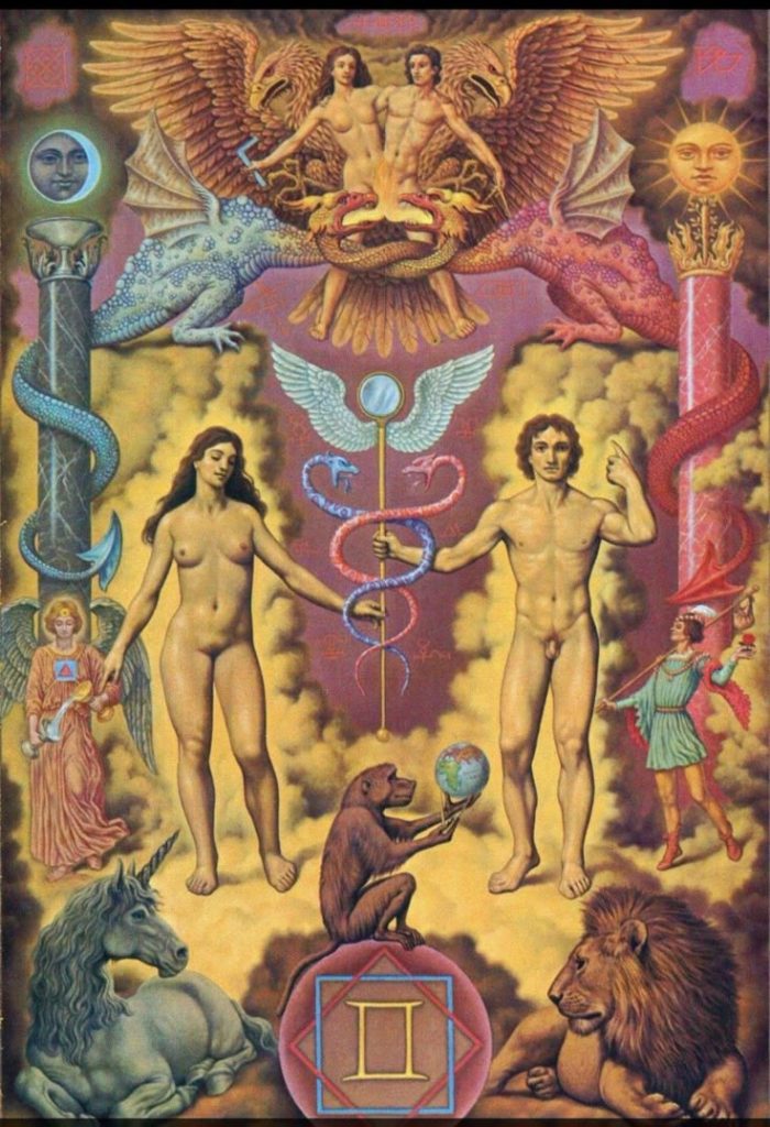Ez alapvetően Patrick Carré, a Francs Macons Alchimister Ikrek zodiákus ábrázolása, ebben az esetben