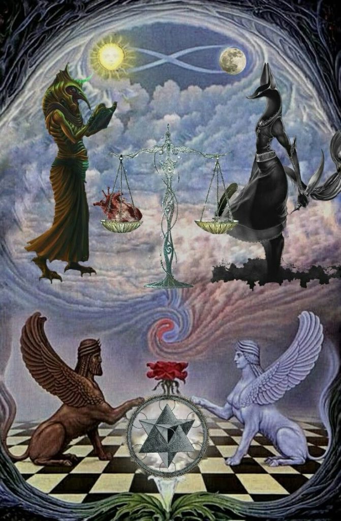 elé vezeti. Ekkor a halottak egy hatalmas mérleg előtt találják magukat, amely mellett Anubisz a lélek vezetője, a halott szívét helyezi, az egyiptomiak úgy gondolták,” itt lakik az értelem, az ember gondolatainak és cselekedeteinek irányítója”. A másik serpenyőben Maat tollát látjuk, ami itt az igazságot jeleníti meg.